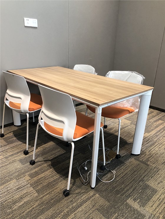 小型会议室采用原木桌面,白椅橙坐垫。清新的颜色可以让小型会议的气氛活跃。