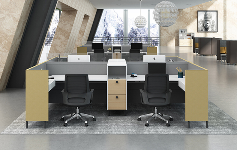 上金办公家具库艾特系列职员位采用单人、对位两种方式。台面梯形开口隐藏走线、吊抽满足办公收纳的同时更整洁办公空间,组合形式满足单人、二人、四人工作位。