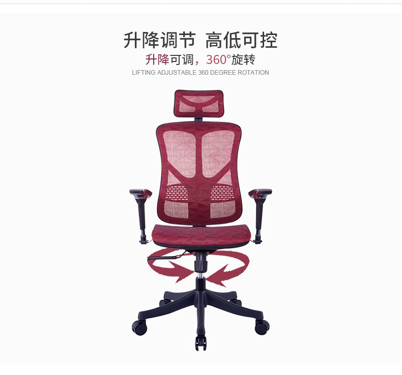 同步倾仰,一杆式底盘,后仰弹力调整;座垫可高低调整;结构性强、背、坐面均为呼吸式透气阻燃网布;自动弹性腰枕;独立升降扶手。