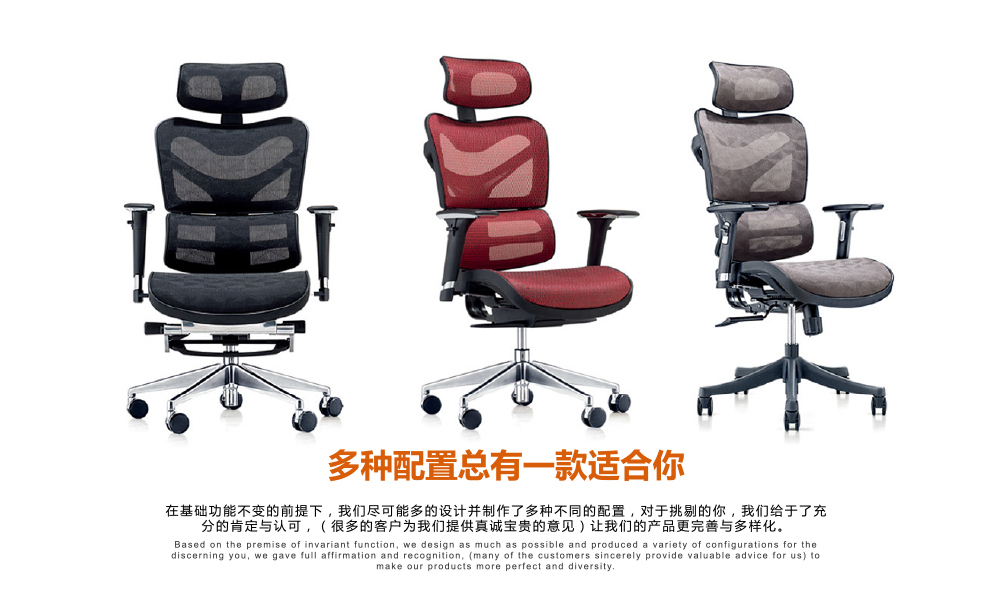 头枕可高低调整;全国首创专利型三键线控操控底盘、可同步倾仰、135°无间断锁定;人性化后仰弹力调整;腰背分离式设计,包覆式腰枕,椅背可高低调整,座垫可高低调整及座深调整;电镀3D扶手可高低升降、扶手面左右旋转及前后滑动;静音滑轮。